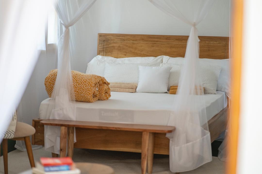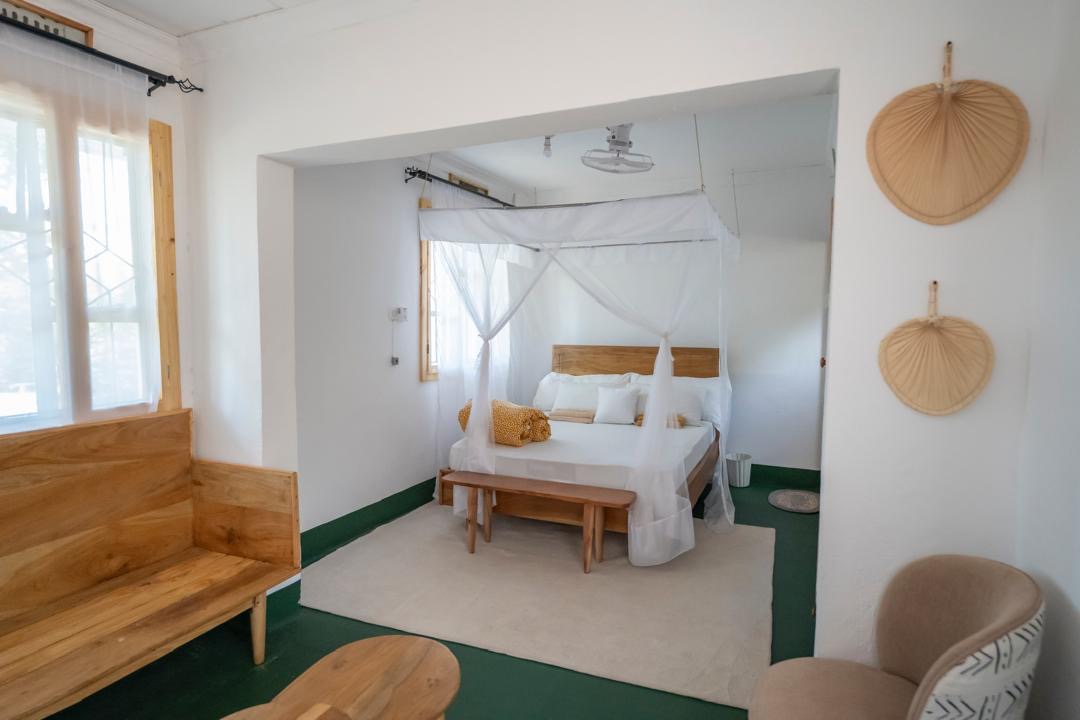 A quiet, garden-facing room designed for rest and focus, perfect after a day exploring Moshi